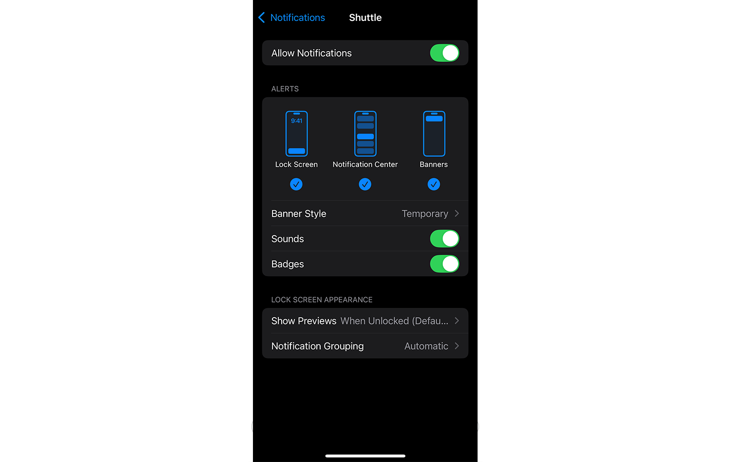 Shuttle often sends out discount codes, promotions, and important updates like delivery status and cancellations through app notifications. Keeping your notifications turned on ensures you don’t miss out on limited-time deals or important updates about your orders. If you aren't receiving updates, just head over to your phone’s Notification Center to make sure notifications are toggled 'on' for the Shuttle app.